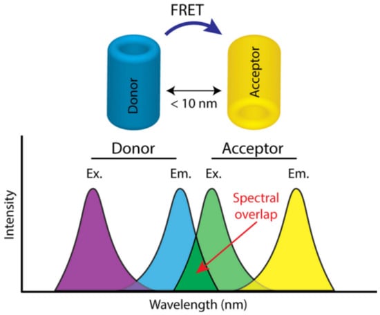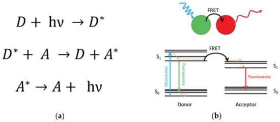 A more detailed theoretical description of this mechanism consists of a donor entity reaching an excited state due to interaction with a photon. Subsequently, according to the Kasha rule, the donor chromophore undergoes a relaxation process to the lowest excited singlet state (S1). Importantly, the acceptor chromophore group, which must be at an average distance no larger than 10 nm, absorbs the released energy (undergoes a simultaneous excitation process) when the electron returns to the ground state of the donor chromophore (S0). Importantly, this non-radiative process that occurs through a dipole–dipole coupling is called “resonance energy transfer” [,]. Lastly, the exciting electron from the acceptor chromophore group returns to the ground state S0, releasing a photon.