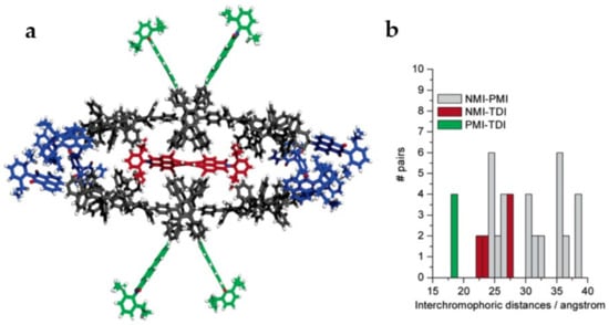 (a) Illustration of the energetically minimized structure of the triad constituting naphthalenemonoimide(blue), perylenemonoimide(green), and terrylenediimide(red) moieties. (b) Center-to-center interchromophoric distances calculated from the energetically minimized structure. Reprinted with permission from []. Copyright 2005 American Chemical Society.