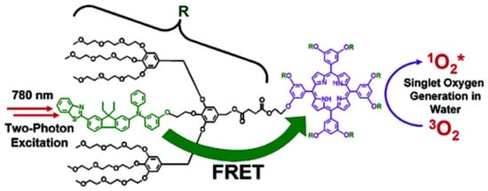 Inspired by the singlet oxygen species produced through the light-harvesting process by chlorophyll molecules in photosynthesis, Oar et. al [] (Figure 10) designed water-soluble dendrimeric photoactive systems to increase the generation and propagation of reactive oxygen species (ROS). Singlet oxygen is a chemical species of high interest since its efficient generation could be useful in various technological developments, such as the photocatalytic degradation of polluting species present in various sources. In photodynamic therapy and tissue imaging, the generation of ROS would help to reduce the limitations depth that exists in different types of living tissue and to obtain an enhanced spatial resolution []. The strategy that was carried out contemplated using indirect excitation of spatially separated chromophores present in the dendrimer structure by two-photon-excited fluorescence resonance energy-transfer (FRET). In this technique, the donor entity is excited with two photons with wavelengths belonging to the near-infrared (NIR) spectrum. The two-photon absorbing donor chromophores were covalently bonded to the periphery of the dendrimer structure. Furthermore, porphyrin is located at the core of the dendrimer, which acts as an acceptor chromophore and a singlet oxygen-generating species. The authors demonstrated an exceptionally high FRET efficiency (>99%) between the peripheral donor chromophores and the central acceptor, caused by the transfer of fluorescence resonance energy excited by two photons in aqueous medium.