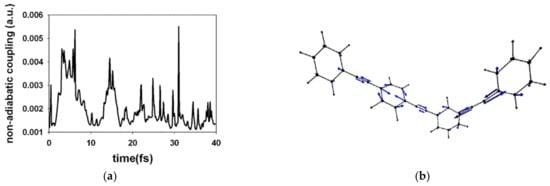 Importantly, experimental studies, combined with theoretical analyses, allowed researchers to delve into ultra-fast and unidirectional electronic energy transfer processes in complex systems designed to spatially orient the initial excitation in an energy sink environment []. The analysis of the population of the excited state and the distribution of the excitation energy of the atoms belonging to π-conjugated dendrons composed of phenylene-ethynylene (PE) units allowed us to infer that the mechanism of electronic energy transfer involves the ultra-fast collapse of the photoexcitation wave function due to non-adiabatic electronic transitions []. In this dendrimer system, there is a significant density of relatively delocalized coupled excited states produced by the initial excitation energy (thermal disorders could also contribute). Interestingly, the significant coupling of high-frequency vibrational modes promotes non-adiabatic electronic transitions []. Simultaneously, the excess electronic energy is converted into nuclear motions spread throughout the molecule (loss of anisotropy). In this way, it is proposed that dynamic phenomena of a non-adiabatic nature were essential for π-conjugated systems []. For this type of entity, a strong contribution to the ultrafast dynamics of excitation localization by appreciable densities of excited states, strong exciton–phonon coupling, and relevant thermal fluctuations would be highly favored [].
