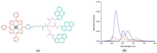 (a) Chemical structure of first-generation pyrene dendronized porphyrins having a metal center and (b) absolute emission spectra recorded in THF for the metal-free (black line) and metalated porphyrins (M = Zn and Mg are represented by red and blue lines, respectively). Reprinted with permission from []. Copyright 2021 Elsevier.