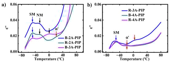 Dielectric loss ε″ for different copolymers as a function of the temperature at 6.9 Hz ((a) B-2A-PIP, R-2A-PIP, B-3A-PIP and (b) R-3A-PIP, B-4A-PIP, R-4A-PIP).