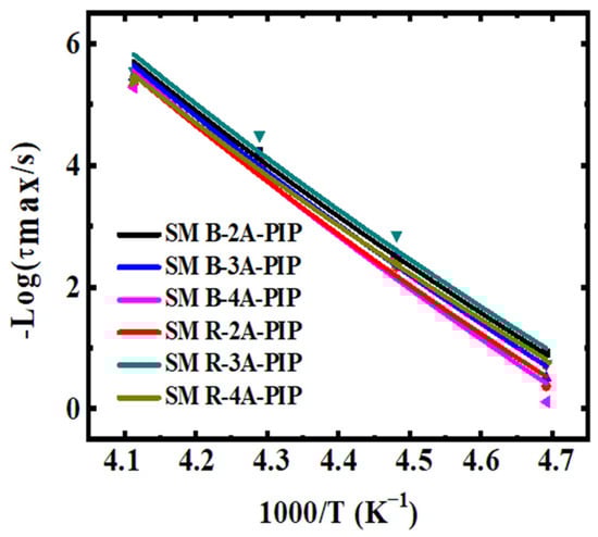 Furthermore, while the NM relaxation of B-2A-PIP, R-2A-PIP and B-3A-PIP conform to the VFT equation, the Arrhenius-like equation is used to calculate the apparent activation energy [48,49]: