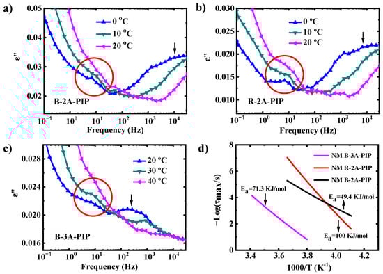 Dielectric loss ε″ as a function of the frequency at for (a) B-2A-PIP, (b) R-2A-PIP and (c) B-3A-PIP. (d) The temperature dependence of τmax for NM relaxation of B-2A-PIP, R-2A-PIP and B-3A-PIP.