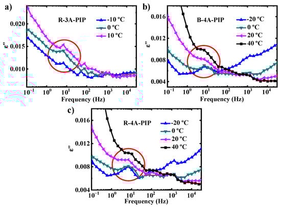 Dielectric loss ε″ as a function of the frequency for (a) R-3A-PIP, (b) B-4A-PIP and (c) R-4A-PIP.