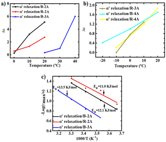 (a,b) Temperature dependence of ∆ε for a′ relaxation; (c) Arrhenius model for a′ relaxation. Solid line represents fitting curve.