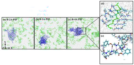 To deeply understand the influence of terminal oligopeptide and its length on the microstructures of copolymers, the molecular dynamics simulation method was carried out. The frame structures of B-2A-PIP, B-3A-PIP and B-4A-PIP are shown in Figure 7. Oligopeptides in block part tend to form nano-sized aggregates, reflecting the influence of terminal oligopeptide on their self-assembly. The structures are further dissected into different layers along the z-axes for better understanding the distribution of oligopeptides and how they interact, as shown in Figure S13–S15. Block oligopeptides are surrounded by abundant random oligopeptides. For B-2A-PIP, the random dipeptides tend to be evenly distributed in all slices. For B-3A-PIP and B-4A-PIP, tripeptides or tetrapeptides increase in the slices with block oligopeptides presented. In particular, one more nano-sized aggregate formed by random tetrapeptides in Figure S14e also increase the number of tetrapeptide chains in that slice. These results can qualitatively support the experimental findings that the microstructures of copolymers become more heterogeneous with increasing oligopeptide length, and may increase the mechanical strength of elastomers. Detailed analyses into structural features of B-4A-PIP shown in Figure 7d,e indicate that block tetrapeptides are likely to form structures with obviously β-sheet feature. In comparison, the interactions between random tetrapeptides can form less ordered β-sheet features.