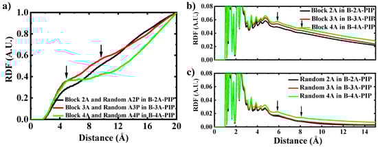 The functions of terminal oligopeptide in copolymers are explored by putting block and random oligopeptides into one or two simulation boxes. Radial distribution functions (RDFs) are used to describe the structures, as shown in Figure 8. Firstly, the interactions between the block and random oligopeptides in one simulation box are analyzed (Figure 8a). In the tetrapeptide system, the peaks formed around 5 Å and 10 Å are sharper than those in the dipeptide and tripeptide systems, as indicated by the black arrows. This suggests that much more ordering structures are formed for tetrapeptides than the others. Increasing the oligopeptide length facilitates more ordering structures. Next, the interactions within block or random oligopeptides in two different simulation boxes are analyzed. In the block system, the curve with similar peak shapes but higher ordinate values are observed for tetrapeptides compared to dipeptides and tripeptides, as indicated by the black arrows. This suggests that increasing the oligopeptide length has a slight influence on the ordered degree of structures while significantly increasing the number of ordered structures in the block system, while in the random system, much sharper and higher peaks of tetrapeptides than the others are observed. It indicates that increasing the oligopeptide length improves both the ordered degree of structures and the number of ordered structures in the random system. Conclusively, the terminal block interaction increased the ordered structures which may well increase the mechanical properties while the increased length of oligopeptide form more, ordered sheet structures in random system. The two factors cause the abnormal difference of β-sheets structures in B-3A-PIP, R-2A-PIP and B-3A-PIP, R-3A-PIP.