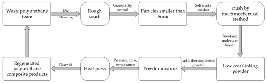 In summary, the mechanical method is feasible for recycling thermosetting plastics, but it is mainly focused on the mechanical properties of recycled materials, which is undoubtedly a waste for polyurethane foam with high thermal insulation capacity. This research is an attempt to recycle polyurethane foam and make it into an insulation material that can be used in buildings. Mechanochemical method was used to recover polyurethane foam as filler, recycled polypropylene as the matrix, without adding any other adhesive, only change the polyurethane particle size, proportion, and heat pressing parameters, and the thermal conductivity and tensile strength of the product were evaluated. The recovery process of polyurethane foam by the mechanochemical method is shown in Figure 1.