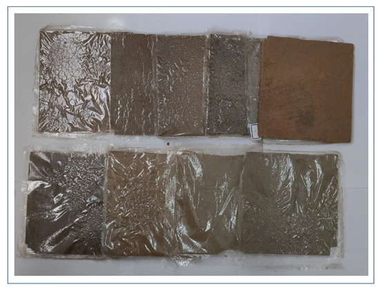 The polyurethane foam powder was molded with the flat vulcanizing machine XLB350X (Qicai Hydraulic Machinery Corp., Shanghai, China). To facilitate demolding, a layer of PET film is laid on the bottom of the mold. The melting point of PET is above 250 °C, which can prevent the melt from bonding with the mold. Mix the waste polyurethane foam powder and recycled PP material evenly, lay the mixture in the mold, put another layer of PET film on the powder, cover the press mold. Preheat mold at 175 °C for 10 min before each experiment. Then the heat pressing is carried out at the temperature and time in the table. After the heat pressing, the exhaust is released for 10 min, and then kept warm for 10 min. Finally, remove the mold and cool it to room temperature before demolding. The size of the board is 150 × 150 × 5 mm3, as shown in Figure 3.
