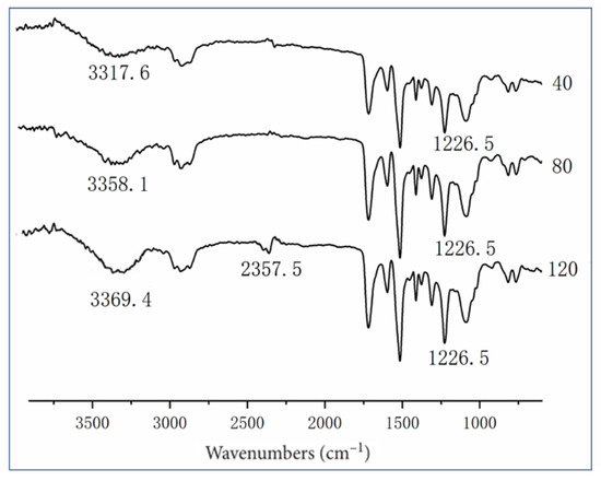 FTIR is used to analyze the molecular structure and group changes in the degradation process, as shown in Figure 5. The characteristic peak of amino (–NH–) is 3317.6 cm−1 in 40 mesh. The characteristic peak of the pulverized particle size is widened in the 200 mesh, and a large amount of hydroxyl (–OH–) appeared and the characteristic peak of the large concentration of amino (–NH–) is formed by coincidence. This is the result of the C–O bond breaking to form the hydroxyl (–OH–) group. With different mesh numbers, cyanate group characteristic peaks appeared in wave numbers 3317.6–3369.4 cm−1, indicating the rupture of the carbamate group at the C–O bond and the emergence of a new isocyanate group.