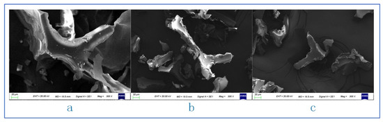 The micrograph of PUF powder is shown in Figure 6a (40 mesh, loading voltage is 20 kV, magnification is 50 times). It can be seen that there are a lot of fibers in PUF powder, which come from the fireproof layer mentioned above. In this study, choosing to retain these fibers can not only reduce the pre-treatment cost but also effectively improve the mechanical properties of plastics by adding fibers into plastics. Micrographs of 40 mesh, 80 mesh, and 120 mesh powders are shown in Figure 7 (loading voltage 20 kV, magnification is 300 times). It can be seen that the shapes of the three powders are similar, but the 40-mesh powder retains more of the pore structure of polyurethane foam, which can be seen more clearly in Figure 6b (40 mesh, loading voltage 20 kV, magnification 200 times). This explains the influence of mesh number on thermal conductivity well. The melted polypropylene covers the surface of polyurethane foam powder and generates bubbles again, which can greatly reduce the thermal conductivity. However, the existence of a large number of bubble structures also causes it to become a weak point in the tensile test.