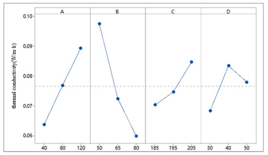 Table 5 shows the results of the range analysis of thermal conductivity. Ki represents the average value of thermal conductivity under a certain factor. The mesh size (A) is positively correlated with the thermal conductivity. The larger the mesh size of the powder is, the larger the thermal conductivity is, that is to say, the worse the thermal insulation performance is (Figure 8A). Temperature (C) showed similar results to mesh (A) (Figure 8C). On the contrary, the higher the proportion of polyurethane powder (B), the lower the thermal conductivity (Figure 8B). When the value of factor time (D) increases, the corresponding value of Ki increases first and then decreases (Figure 8D). According to R-value, the factors can be arranged as B > A > D > C, indicating that the proportion of polyurethane has the greatest influence on thermal conductivity, followed by the particle size of polyurethane powder, temperature and time have less influence.