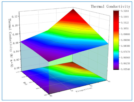 According to the results in Table 4, ANOVA is conducted for thermal conductivity, and statistical results were listed in Table 6. SS is the sum of squares of variables; DOF represents degrees of freedom; MS is mean square, that is, the ratio of SS to DOF; F and P are the values that determine whether the variable is significant. The high value of F and the low value of P indicate that the variable is more significant [27]. As can be seen from Table 6, the results of ANOVA are consistent with the previous range analysis, and the proportion of polyurethane powder has an important influence on the thermal conductivity. Because polyurethane foam powders do not melt when heated, there are many gaps between the powders, and the melted polypropylene seeps into these gaps and joins the powders. As the proportion of polyurethane foam powder increases, the proportion of polypropylene decreases, and polypropylene cannot be filled into the gap, resulting in a large number of bubbles. This is also the reason why the mesh size will affect the thermal conductivity. The smaller the mesh of the powder, the larger the particle size, and the gap is also larger. This can also be seen in the micrograph. To more intuitively express the influence of factors on thermal conductivity, the proportion and mesh number of polyurethane foams are selected as conditions to draw the Surface projection, as shown in Figure 9. Minitab software is used to analyze the linear regression equation of thermal conductivity coefficient Υ1: