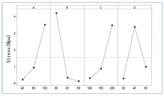Effect of factors at different levels on stress: (A) Mesh. (B) Proportion. (C) Temperature. (D) Time.