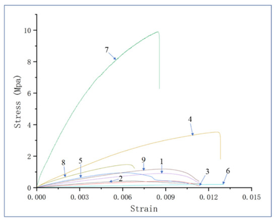 Stress versus strain curve (The numbers in the figure represent different experiment numbers).