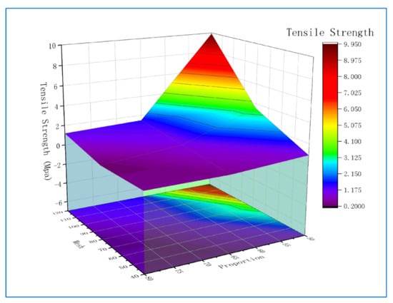 Similarly, the proportion and mesh number of polyurethane foams are selected as conditions to draw the surface projection of its influence on tensile strength, as shown in Figure 12. The linear regression equation of tensile strength Υ2 is:
