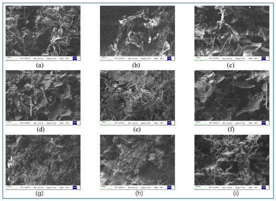 Micrographs of nine boards are shown in Figure 13. The fireproof layer fibers are evident in Figure 13c,f. Note that each row has the same number of mesh and each column has the same proportion. Therefore, it is also easy to compare the effects of mesh and proportion on the board. The lowest thermal conductivity is board No. 3, which can also be seen by comparing 13c with other horizontal and longitudinal pictures. A large number of polyurethane foam powders provides the possibility of low thermal conductivity. A small amount of polypropylene cannot completely wrap the polyurethane foam powder and only plays a role of connection, which is also the reason why the tensile strength of No. 3 board is only 0.4143 Mpa. The opposite is board No. 7, whose micrograph is shown in 13 g. Board No. 7 contains 50%, 120 mesh polyurethane foam powder, which is completely coated with equal weight polypropylene. It is not available on other boards. It also brings excellent tensile strength to the No. 7 plate. It is worth mentioning that the thermal conductivity of No. 7 board is 0.1263 W/m·K, which is 54% of the thermal conductivity of pure polypropylene board (about 0.23 W/m·K). It is also proved that 120 mesh polyurethane powder has a great influence on reducing thermal conductivity.