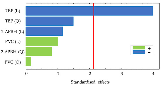 In order to study the optimal composition of the optical sensor, a 3(k−k) fractional factorial design with two central points and two blocks was performed studying three variables (amount of PVC (g), volume of TBP (mL), and amount of 2-APBH (g)) by following the procedure described in Section 2.3. The exponent k indicates the number of variables, and the base indicates the levels of each variable. All variables presented three levels: an upper level (+1), a central level (0), and a lower level (−1). The corresponding values of each level for the different variables are shown in Table 1. A total of 22 random runs were performed: each membrane composition was prepared twice in different days, and, in turn, the exposure experiment for each membrane was carried out in duplicate. All the experiments were carried out by exposing the sensor to 1 mg L−1 of Cd(II) solutions at pH 9 (buffered by 0.225 mg L−1 ammonium chloride/ammonia solutions). The difference between the absorbance measurement of the sensor before and after the exposure time (30 min) to the solution is defined as the response of the sensor. Table 2 shows the matrix of each experiment, the response of the sensor exposed to Cd(II), and the standard deviation of these measurements. The significance of the effects of the three variables was studied for a 95% confidence interval. The analysis of the experimental design showed non-significant interactions between the effects of the sensor exposed to Cd(II) on the response. The Pareto chart for the lineal (L) and quadratic (Q) main effects is shown in Figure 2.