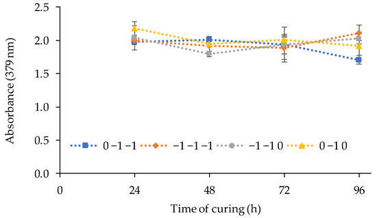 The results showed in most cases a decrease in the sensor signal after the first 48 h of curing. On the other hand, the best stability of the signal, and therefore the lower deviation between replicates for the first 48 h, corresponded to the synthesis of the PIM with the central level of PVC (0) and the lower level of 2-APBH (−1). Thus, the optimal PIM composition to obtain the best response of the sensor was established in: 2.5 g of PVC, 3 mL of TBP, and 0.02 g of 2-APBH. In addition, the curing of the optical sensor can be completed within the first 24–48 h after the synthesis because, for 72 h, a decrease was observed.