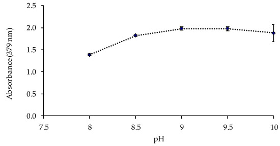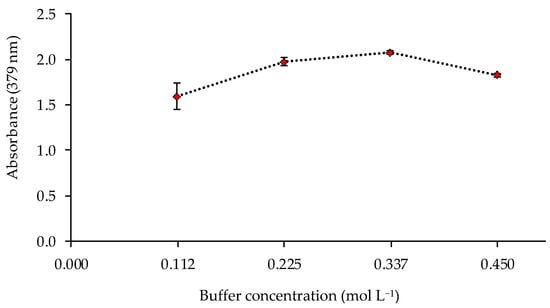 The pH value and the buffer concentration in the metal solution could affect the response of the sensor. Thus, the sensor was exposed to solutions of 1 mg L−1 of Cd(II) at different pH values (8, 8.5, 9, 9.5, and 10) controlled by 0.225 mol L−1 ammonia buffer solutions. The best responses of the sensor were obtained at pH 9–9.5 (Figure 4). The influence of the buffer concentration was also studied at pH 9.5, obtaining a higher absorbance value for a buffer concentration of 0.337 mol L−1 (Figure 5).