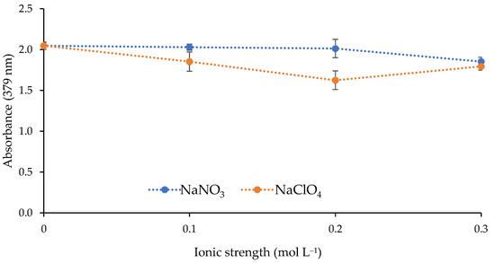 The effect of the ionic strength of the metal solution on the response of the sensor was investigated. Two different salts (NaNO3 and NaClO4) were used to increase the ionic strength of the solution by adding the following concentrations: 0, 0.1, 0.2, and 0.3 mol L−1. As shown in Figure 6, the increase in ionic strength did not improve the sensor response.