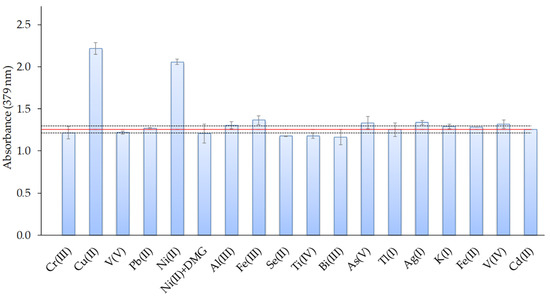 The selectivity of the sensor was investigated as a function of the degree of interferences found in the presence of different ions such as Ag(I), Al(III), As(V), Bi(III), Cr (III), Cu(II), Fe(II), Fe(III), K(I), Ni(II), Pb(II), Se(II), Ti(IV), Tl(I), V(IV), and V(V). For that, the effects of these ions on the response of the sensor were evaluated at a 1:1 Cd(II): interfering ion ratio, using metal ion concentrations of 0.4 mg L−1. The tolerance limit was defined as the concentration of the added ion causing a relative error less than ±5% in the optical-sensor response. The results are shown in Figure 9 and indicated that most of the studied ions produced low interference or did not affect the Cd response, except for Cu(II) and Ni(II) ions. The pre-treatment of the metal solution with dimethylglyoxime (DMG: 0.068 mmol L−1) addition and filtration before Cd(II) analysis avoided the Ni(II) interference (Figure 9).