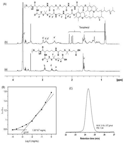 The polymer and modified tocopherol were confirmed by 1H NMR. The spectra were obtained with a Bruker spectrometer (AVANCE III 400; Bruker, Billerica, MA, USA) operating at 400 MHz to detect protons. CDCl3 or deuterated dimethyl sulfoxide (DMSO) was the solvent. The molecular weight and molecular weight distribution of the polymer were determined using gel permeation chromatography (GPC, 1514, Waters, Milford, MA, USA) equipped with a Waters 2414 refractive index detector and Waters Styragel HR columns.