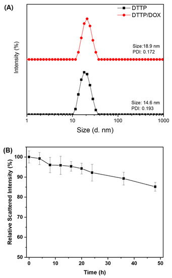 DTTP self-assembled to form nanostructures in aqueous media because of the hydrophilic PEG and the hydrophobic tocopheryl groups in its molecular structure. Here, we applied the solvent evaporation method to prepare the DTTP nanoparticles. The drug-loading content and efficiency of the DTTP micelles were determined using DOX as a hydrophobic drug. The polymer:DOX feed ratios were in the range of 1:0.2–1:1 and the polymer concentration was 1 mg/mL. At a polymer:DOX feed ratio of 1:0.2, the maximum loading content and efficiency of the mPEG-TK-TP micelles were 8.52 ± 0.22% and 42.6 ± 2.3%, respectively. The DOX loading content and efficiency slightly decreased with increasing polymer:DOX feed ratio (Table 1). We used DLS to determine the size and distribution of the blank- and DOX-loaded micelles with maximum loading content and efficiency. The diameter of the DOX-loaded micelles was 18.9 nm. By contrast, the diameter of the DTTP micelles was 14.6 nm. Thus, the particle size changed in response to DOX encapsulation (Figure 2B). Moreover, the DOX-loaded micelle and DTTP particle sizes were within the desired 10–100-nm range. Therefore, these structures could avoid renal clearance and recognition by macrophages. The zeta potentials of the blank- and DOX-loaded micelles were 1.30 ± 3.91 and 1.88 ± 1.99 mV, respectively. For this reason, the neutrally charged PEG was localized mainly to the particle surfaces. To evaluate micelle stability, excess SDS as a destabilizing agent was added to the micelle solution and the scattered light intensity was monitored over time using DLS. When a DTTP micelle solution (0.1 mg/mL) was mixed with an equal volume of a concentrated SDS solution (0.5 mg/mL), the DTTP micelles showed enhanced stability as the scattered light intensity was reduced by less than 15% over 48 h. It is notable that, considering that DTTP is composed of weakly hydrophobic tocopheryl groups, the stability of DTTP micelles was comparable to that of the crosslinked micelles [46].