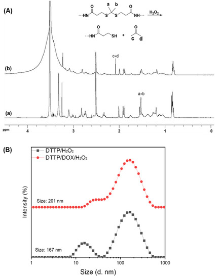 1H NMR spectra of DTTP (a) and cleaved DTTP in deuterated DMSO containing H2O2 and metal tracer (CuCl2) (b) (A). Particle size distributions of DTTP- and DOX-loaded micelles measured by DLS after incubation at 37 °C for 24 h in aqueous solutions containing H2O2 and CuCl2 (B).