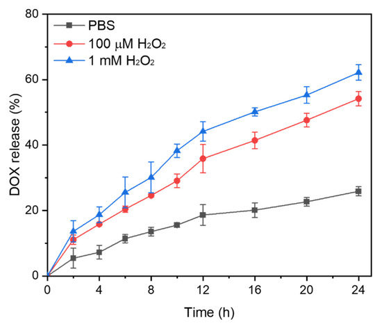 In vitro release profiles of DOX from DOX-loaded micelles subjected to different H2O2 concentrations. Data are means ± S.D. of three independent experiments.