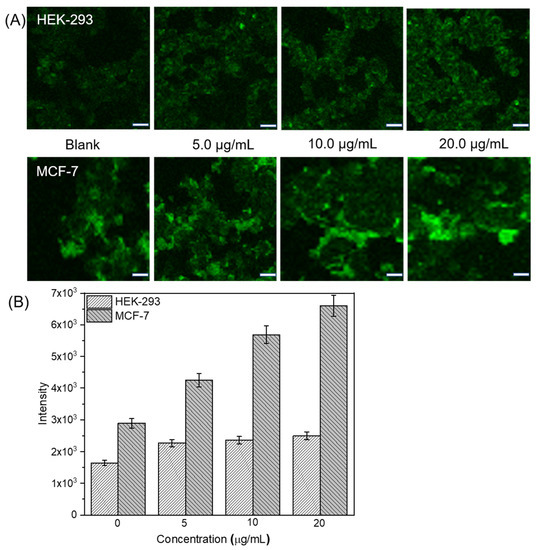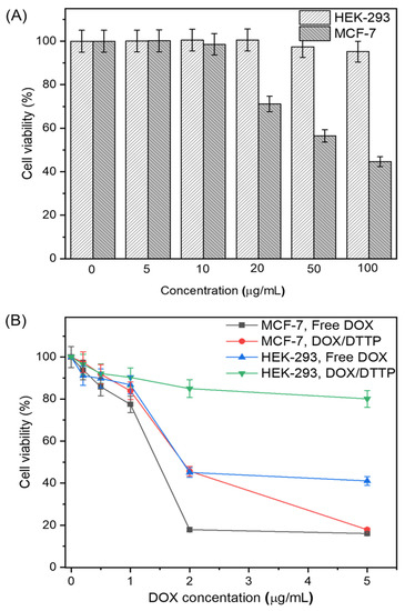 Cell viability in the presence of DTTP micelles was evaluated by the CCK-8 assay. Nanomaterial biosafety is a mandatory precondition for practical clinical application. We assessed the effects of blank DTTP micelles on MCF-7 and HEK-293 cell growth after 24 h of incubation. Figure 6A shows that the HEK-293 cell viability was higher than 90% even in the presence of 100 μg/mL DTTP micelles. Therefore, the latter exhibited low toxicity and stable drug delivery. At ≤10 μg/mL, DTTP micelles were not significantly cytotoxic to MCF-7 cells but were substantially cytotoxic at concentrations >20 μg/mL. Thus, DTTP micelles were considerably more toxic to MCF-7 than HEK-293 cells. The tocopheryl moieties desorbed from the micelles were absorbed by the cells after the ROS in the cancer cells cleaved the thioketal linkages in the DTTP micelles. We then measured the inhibitory effects of free DOX on MCF-7 and HEK-293 cells. There was significant dose-dependent cytotoxicity in both cell types incubated with DOX for 24 h. The IC50 were ~1.4 μg/mL and ~1.9 μg/mL for MCF-7 and HEK-293 cells, respectively (Figure 6B). We also investigated the viability of MCF-7 and HEK-293 cells exposed to DOX-loaded DTTP. HEK-293 viability remained >80% even at [DOX] = 5 μg/mL. For this reason, the DOX was tightly encapsulated in the DTTP micelles and there was negligible drug release under the very low ROS concentrations in normal cells. By contrast, DOX-loaded DTTP was evidently toxic to MCF-7 cells. The elevated ROS concentrations in the cancer cells cleaved the thioketal linkages in the DTTP micelles and the DOX was released and diffused. The foregoing findings demonstrate that ROS plays important roles in intracellular DOX release from DTTP micelles.