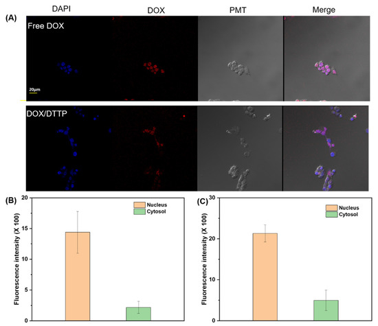 CLSM images of MCF-7 cells incubated with free DOX and DOX-loaded DTTP micelles for 24 h. Left to right: DAPI staining; intracellular DOX fluorescence; photomultiplier (PMT) images; and overlays of two images (A). Fluorescence intensity in nucleus and cytosol after treatment with free DOX (B). Fluorescence intensity in nucleus and cytosol after treatment with DOX-loaded micelles (C).