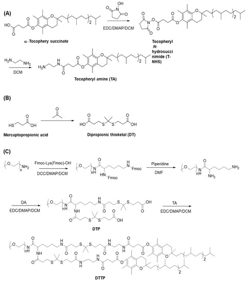 Syntheses of tocopherylamine (TA) (A), dipropionic thioketal (DT) (B) and dithioketal-linked ditocopherol polyethylene glycol (DTTP) (C).