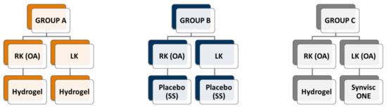 The animals of group C were surgically operated similarly; however, the induction of osteoarthritis was performed in both knees: 28 days after the intervention, 0.3 mL of HA was injected in the left knee and 0.3 mL of the injectable formulation under study was injected in the right knee.
