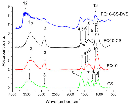 We used the spectroscopic method of FTIR to evaluate groups that appeared to be involved in the interaction of PQ10 and CS. Figure 2 shows the spectra of the crosslinked hydrogel (PQ10-CS-DVS, sample 3-3, see Table S1, Supplementary Materials), the non-crosslinked PQ10-CS complex, and the spectra of the pure substances, with PQ10 and CS as references. In the first case, the non-crosslinked PQ10-CS complex bands were assigned on the basis of the reference spectra of pure substances. Subsequently, they were compared with the spectrum of the crosslinked PQ10-CS-DVS complex, and differences were observed. From the analysis of the aforementioned spectra, the following bands were assigned for the non-crosslinked PQ10-CS complex: