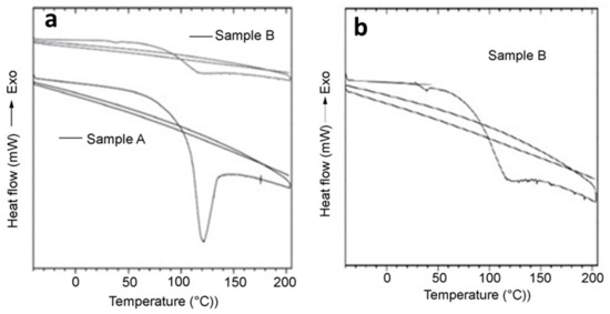 Differential scanning calorimetry (DSC) of hydrogels. (a) shows thermograms of sample 3-3 before (Sample A) and after (Sample B) lyophilization with three scans (heating/cooling/heating). (b) shows an expanded view of the thermal response (DSC) of sample B.