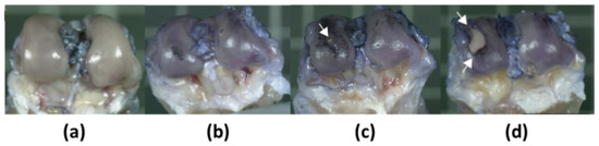 Complete postmortem examination, including a gross assessment of all major organs, revealed no tissue change associated with treatments. The findings were evaluated according to classification grades 1 to 4, as explained above [27]. Figure 5 shows how the Indium ink is retained when cartilage damage is present, and four cases are illustrated, with different levels of cartilage damage.