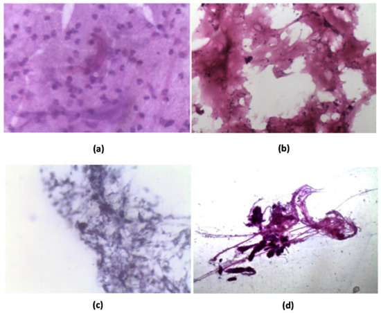 Images (a,b) correspond to positive control. (a) Large amount of basophilic material, slightly translucent, with a large cellular component, composed mainly of polymorphonuclear leukocytes, and predominantly heterophiles. In isolation, traces of an eosinophilic, amorphous, fibrillar, and acellular material can be found. (b) A fibrillar material, amorphous, eosinophilic, acellular, and in large quantities. (c) Negative control shows material that is slightly basophil, which has very fine fibers, forming networks, with few cells between their fibers. The material can be compatible with synovial fluid of the joint. (d) Synovial fluid extracted at a sampling point of 12 months shows fibrillar material, eosinophil, cell inflammation, and mostly composed of heterophilic polymorphonuclear cells and lymphocytes.