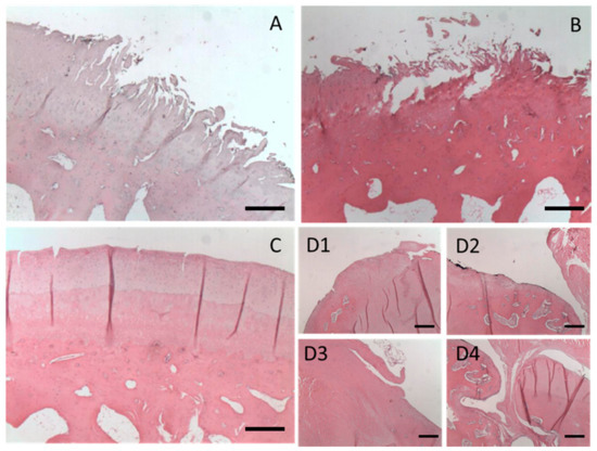 Representative histopathology of femur, Group C, 40×. (A) Right femur, 6 months: a focal region of marked fibrillations of the articular cartilage is observed. (B) Left femur, 6 months: an extensive focal region of articular cartilage erosion is observed, exposing the subchondral bone and numerous fibrillations and fissures at the edges of the said region. (C) Right femur, 12 months: numerous fissures are observed in the hyaline cartilage, which is clearly eroded in its articular surface. The underlying bone presents mild thickening in its architecture (bone remodeling). (D1–D4) Four independent images of the same left femur, 12 months: exuberant lesion, with extensive focal loss of articular cartilage. The components of an old repair of a bone fracture are observed. Greater proliferation of fibrocartilage, bone, and newly formed vessels towards the depth of the femur. Complete loss of the architecture of the articular surface, with marked perivascular fibrosis, covering the joint face of the formed callus. Scale bar: 500 μm.
