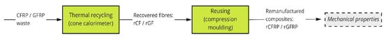 In this study, manufacturing wastes (pre-consumer) of CFRP and GFRP composites from domestic applications were subjected to study. The wastes were provided by Excel composites Oyj (Heinävaara, Finland). The CFRP wastes with a density of 1.81 g/cm3 possessed 55.5 wt% of unidirectional vCF and 44.5 wt% cured epoxy resin. The GFRP wastes with a density of 1.52 g/cm3 possessed a 44 wt% laminated thin-ply vGF structure and 56 wt% unsaturated polyester resin (UPR). Apart from the mentioned features, the mechanical properties of the composites were unknown. Overall, it was assumed that the share of carbon fibres and glass fibres in the composites was 55 wt% for this study. The rest was matrix polymers–epoxy resin in the case of CFRP and UPR in the case of GFRP. Furthermore, these composite wastes were recycled and remanufactured to produce rCFRP and rGFRP composites employing fresh resins with the rCFs and recycled glass fibres (rGFs) to close their life cycle loop.