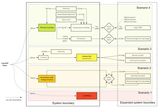 The four scenarios concerning this product system were the thermal recycling process (scenario 4) from the composite wastes to rCFRP and rGFRP production. It consists of two system expansions, first to substitute with virgin composite production and the thermal energy produced during recycling to substitute with natural gas. Cement kiln production (scenario 3) involves hard coal mix for both the composites and an additional bauxite mix for GFRP wastes. The incineration (scenario 2) process utilises energy recovery and an expanded system for electricity and thermal energy substitutions. Finally, landfilling (scenario 1) is used without any possible substitutions.