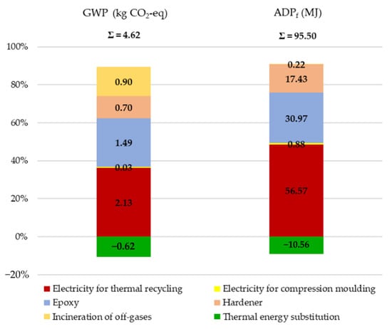 Figure 4 presents the GWP and ADPf impacts from thermally recycling the CFRP wastes and rCFRP production. As seen, the overall carbon footprint of producing 1 kg of rCFRP was 5.68 kg CO2-eq. The largest share of impact 3.07 kg CO2-eq (53.87%) came from electricity consumption to generate the designated heat flux of 50 kW/m2 in order to evaporate the epoxy resin from the composite wastes. The second-largest contribution of 2.30 kg CO2-eq (40.5%) was from the production of epoxy and hardener (resin system) to be employed to produce rCFRP composites. Electricity consumed by compression moulding possessed a minor impact of 0.03 kg CO2-eq (0.53%) on the results. Finally, the incineration of exhaust fumes from thermal recycling generated was 0.94 CO2-eq. (16.55%). However, it was substituted by energy produced from natural gas, whose production emits 0.65 CO2-eq. The ADPf results to produce 1 kg of rCFRP composites were 122.31 MJ. Similar to GWP results, most of its impact, 81.42 MJ (66.56%), comes from the electricity involved in the recycling process. Subsequently, the resin system holds 50.88 MJ (41.60%). Finally, the lower impact contributions were from electricity consumption in compression moulding at 0.88 MJ (0.72%) and the incineration of exhaust fumes at 0.23 MJ (0.19%). The substituted energy produced from natural gas was 11.10 MJ (9.07%).
