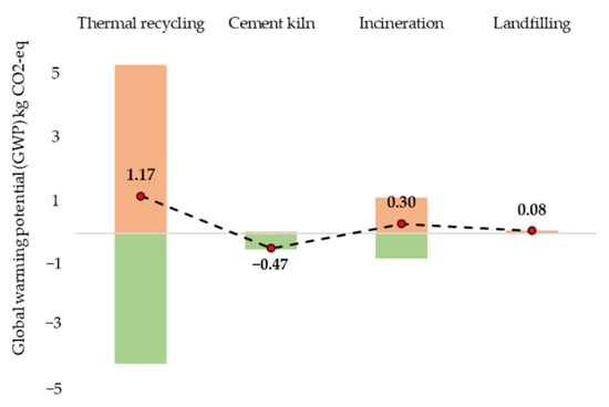 Figure 8 presents the GWP results for 1 kg of GFRP waste disposal using thermal recycling, cement kiln, incineration and landfill. As seen, the cement kiln possesses a reduced GWP impact of 0.47 kg CO2-eq due to GFRP being favourable for cement kiln production along with hard coal and bauxite substitution. The impacts from the thermal recycling route were 1.17 kg CO2-eq, including the substitutions from vGFRP production. Despite the 30.71% lower energy consumption in thermal recycling GFRP wastes compared with CFRP wastes, the higher impact values were reflected due to the lower substitution values from vGF production. As the vCF production was highly energy-intensive with 17.20 kg CO2-eq, substitutions with rCFRP composites 5.38 kg CO2-eq significantly reduced overall emissions, whereas in the case of vGF production, the GWP emissions were 3.43 kg CO2-eq compared with the GWP emissions of 4.62 kg CO2-eq from producing rGFRP. Overall, 34.70% additional emissions were created by producing rGFRP composites. The emissions from incineration were 1.09 kg CO2-eq, whereas the reductions from the energy substitution were 0.80 kg CO2-eq. Finally, landfilling with 0.08 kg CO2-eq emissions was similar to the landfill emissions from CFRP wastes.