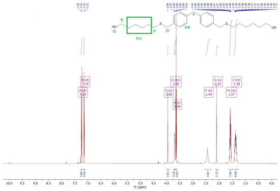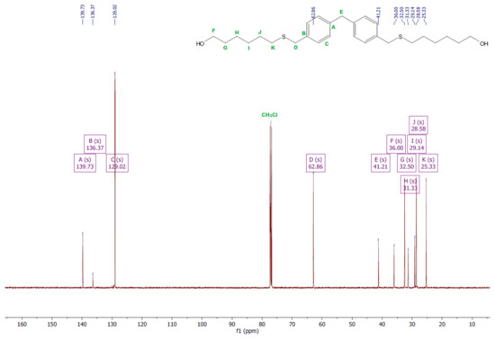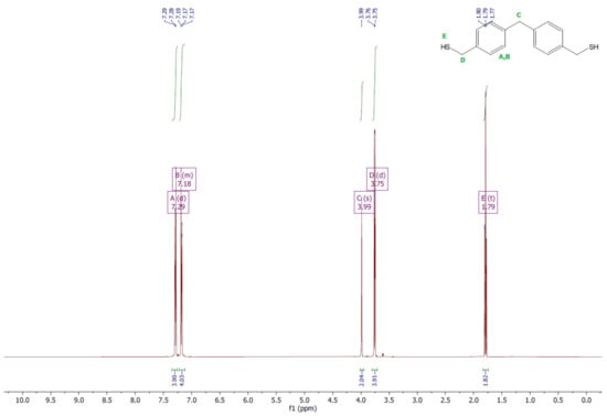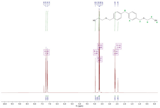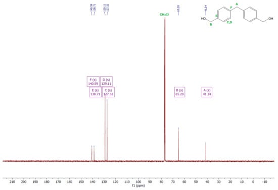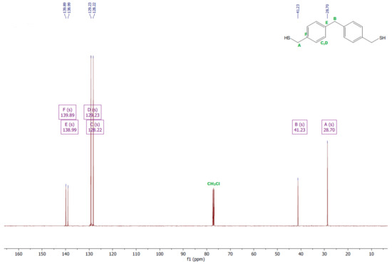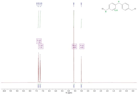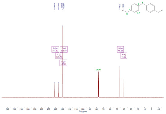 The 1H and 13C NMR analyses were performed for all synthesized monomers and the chlorine derivative of diphenylmethane (1,1′-methanediylbis[4-(chloromethyl)benzene]). NMR spectroscopy was applied in order to determine the monomers’ structures. Deuterated chloroform was used as the solvent. The NMR analysis allowed confirmation of the structures of the obtained monomers. All NMR spectra are presented in Figure 6, Figure 7, Figure 8, Figure 9, Figure 10, Figure 11, Figure 12, Figure 13, Figure 14 and Figure 15. The detailed information about the signals is presented below: