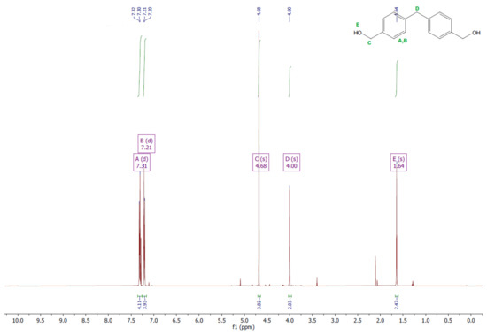 - 1HNMR (500 MHz, CDCl3—d, δ ppm): 7.31 (d, J = 8.1 Hz, 4H), 7.21 (d, H = 8.21 Hz, 4H), 4.68 (s, 4H), 4.00 (s, 2H), 1.64 (s, 2H).
