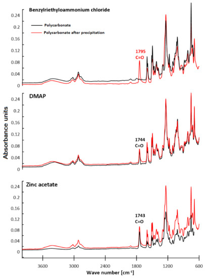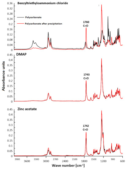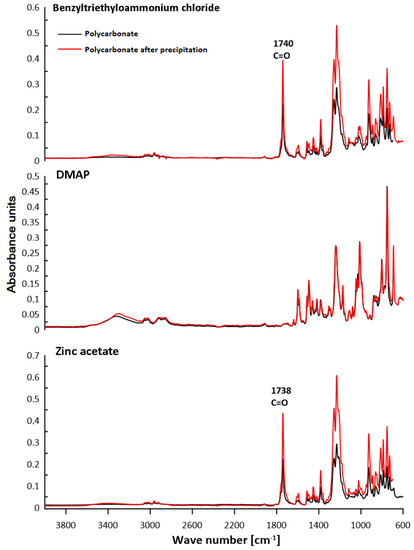 The chemical structure of polycarbonates was confirmed by attenuated total reflection–Fourier transform infrared spectroscopy. The study consisted of observing the changes in the positions of the absorption bands for the characteristic functional groups of the obtained polycarbonates. Figure 16, Figure 17, Figure 18 and Figure 19 present the results of the polycarbonates analyses: the pure polycarbonate and the polymers obtained after precipitation from methane dichloride and methanol. The most important vibrations occurring in the spectra are presented in Table 1.