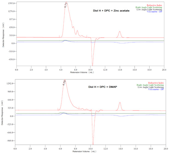 The purpose of the GPC analysis was to determine the molar mass distribution of the obtained polycarbonates. Due to their high chemical resistance (only two polymers completely dissolved in tetrahydrofuran), it was not possible to perform the analysis: the remaining polycarbonates were insoluble or only partially dissolved in THF. The polymers that dissolved in THF (i.e., diol H + DPC + zinc acetate, diol H + DPC + DMAP) were characterized by n = 1570 and 6000 g/mol, w = 4346 and 11,387 g/mol, and molar mass dispersity (ÐM) of 2.768 and 1.898, respectively. Figure 21 shows the chromatograms for these polymers.