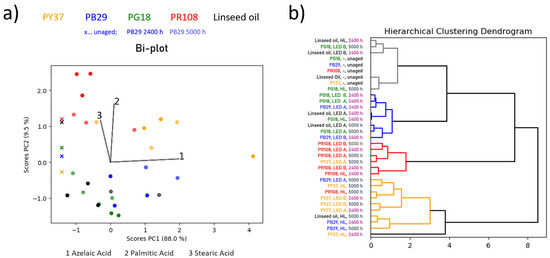 (a) Bi-plot (scores and loadings plot of PC1 vs. PC2) for linseed oil-based mock-ups. The colour of the scores corresponds to the pigment type (e.g., blue-coloured score = blue pigment; the binder without pigment is depicted in black) and its transparency to the ageing time when exposed to various illuminants (higher transparency indicated longer exposure times; unaged sample is indicated by a cross). (b) Dendrogram of the HCA of the PC1 and PC2 scores with the sample names highlighted according to the pigment type or ageing time, respectively.