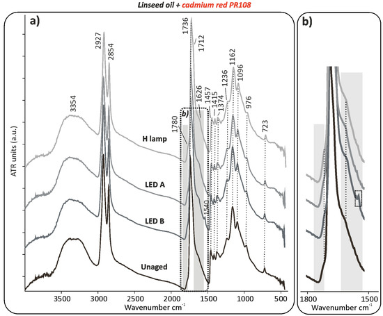 (a) µ-ATR-FTIR spectra of linseed oil with the cadmium red PR108 pigment before and after 5000 h of light ageing (LED A: 420 nm, LED B: 460 nm, and H lamp: halogen lamp). The highlighted regions show the broadening of the carbonyl peak at 1736 cm−1 after ageing, which can be observed in detail in (b).